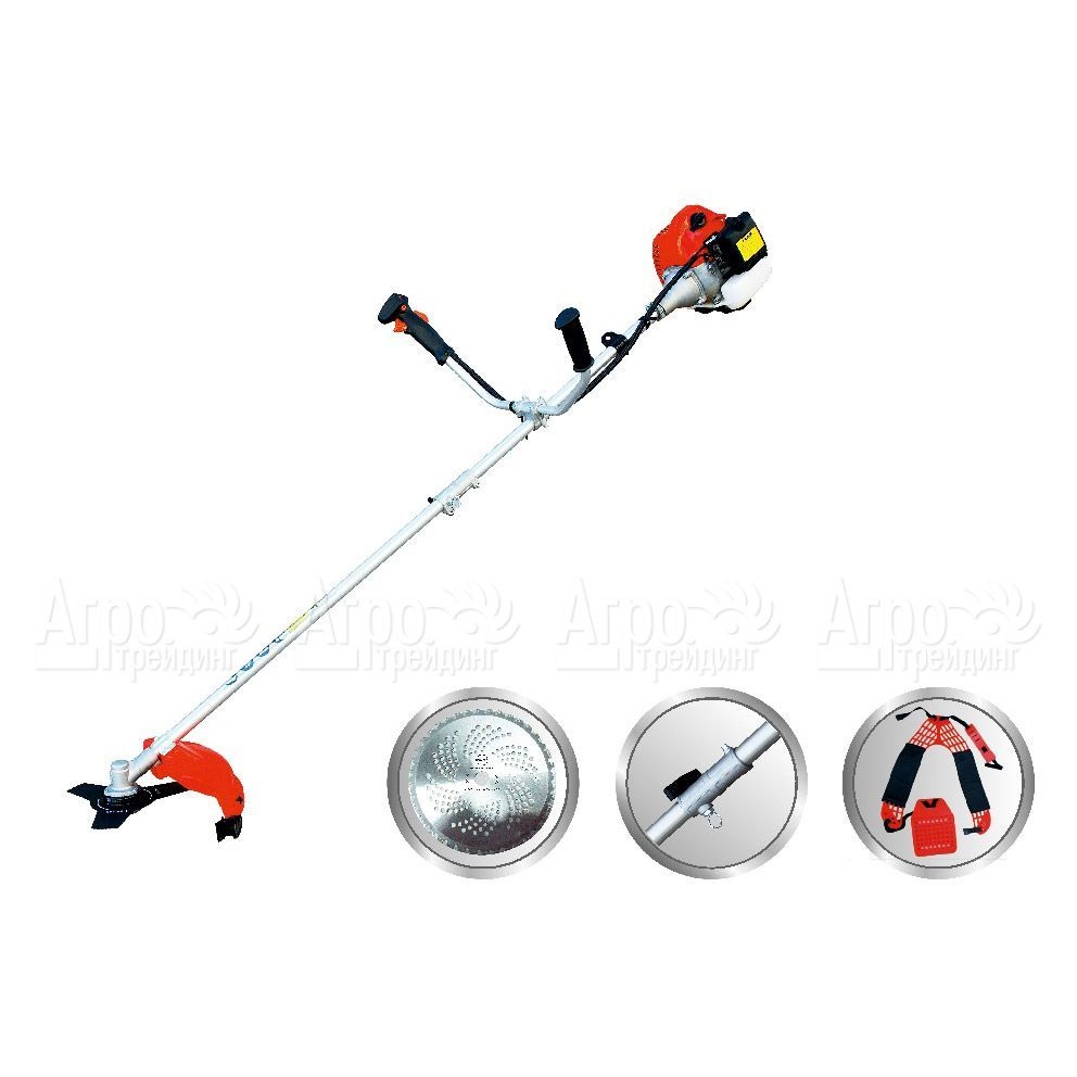 Базовая комплектация: 3-х+40 зубчатый нож, катушка с леской, ранцевый ремень